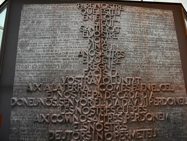 Центральные двери, высотой 5 метров и шириной 4,7 метра, посвящены евхаристии. В их центре выгравирован полный текст молитвы «Отче наш» на каталонском языке, а по всей поверхности дверей повторяется фраза «Хлеб наш насущный, дай нам сегодня» на пятидесяти языках мира. Ручки дверей имеют форму букв A и G — инициалов Антонио Гауди — из строки молитвы «и не введи нас в искушение». На остальных дверях выгравированы другие прошения из «Отче наш», связанные с каждым таинством.