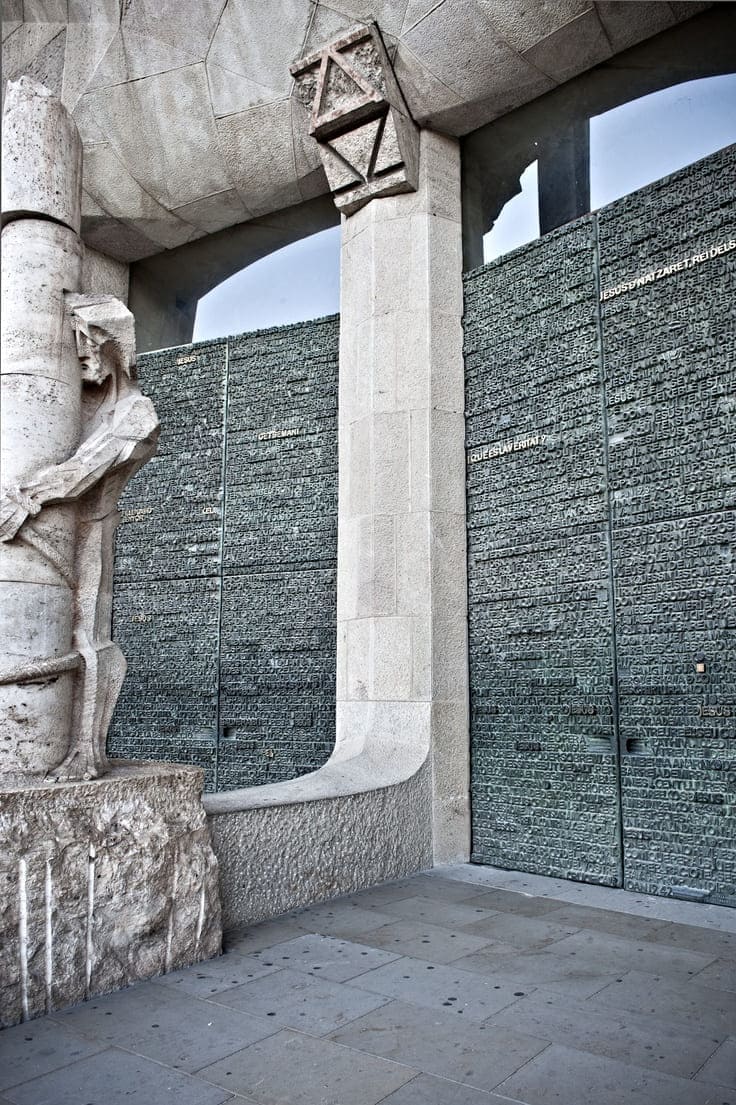 Вход в храм проходит через семь массивных бронзовых дверей, созданных скульптором Хосепом Марией Субирачем. Каждая из них символизирует одно из семи таинств: крещение, миропомазание, священство, евхаристию, конфирмацию, брак и покаяние. Центральные двери, высотой 5 метров и шириной 4,7 метра, посвящены евхаристии: в центре выгравирован полный текст молитвы «Отче наш» на каталонском языке, а вокруг — фраза «Хлеб наш насущный, дай нам сегодня» на пятидесяти языках мира. Ручки дверей выполнены в форме букв A и G — инициалов Антони Гауди — из строки молитвы «и не введи нас в искушение».