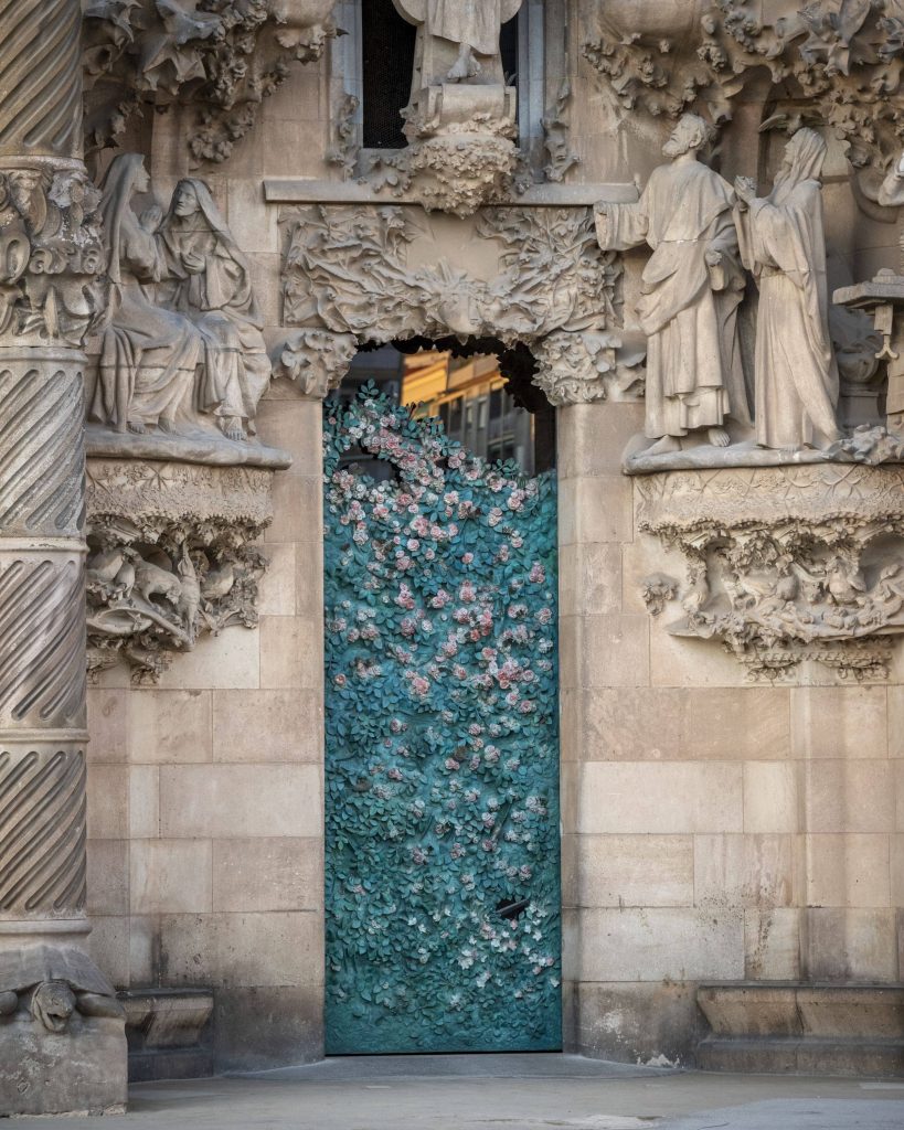 Всего в портике четыре двери, при этом центральная — двойная. Их создал Эцуро Сотоо, использовав полихромную бронзу и стекло. На дверях можно увидеть изображения растений, насекомых и мелких животных. У Портала Веры — дикие розы без шипов, что отсылает к примеру святого Франциска Ассизского, удалившего шипы с роз. На дверях Милосердия изображён плющ — символ послушания, а у Надежды — тростник, напоминающий о камышах у реки, через которую проходило Святое Семейство во время бегства в Египет.