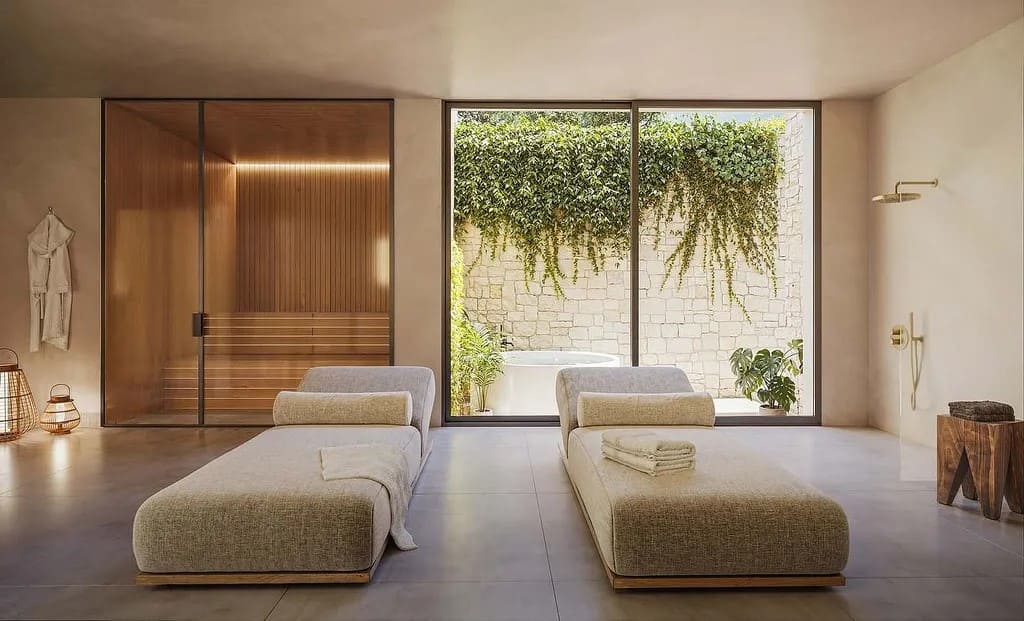 — Просторная SPA-зона: джакузи, сауна, хаммам, двойные душевые кабины и зона релакса с прямым выходом к бассейну и саду.