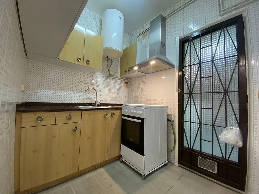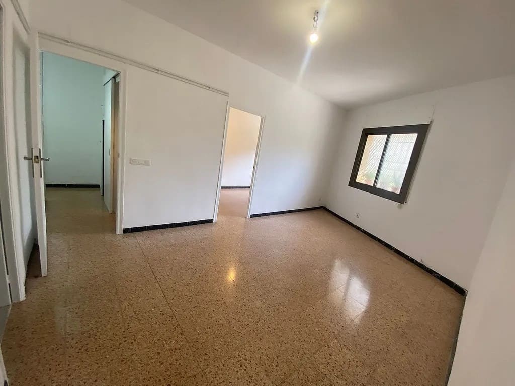 Продается квартира площадью около 55 м² в районе Кан Баро Барселона. Планировка включает 3 спальни, гостиную-столовую, отдельную кухню с выходом в подсобное помещение и ванную комнату с душем.