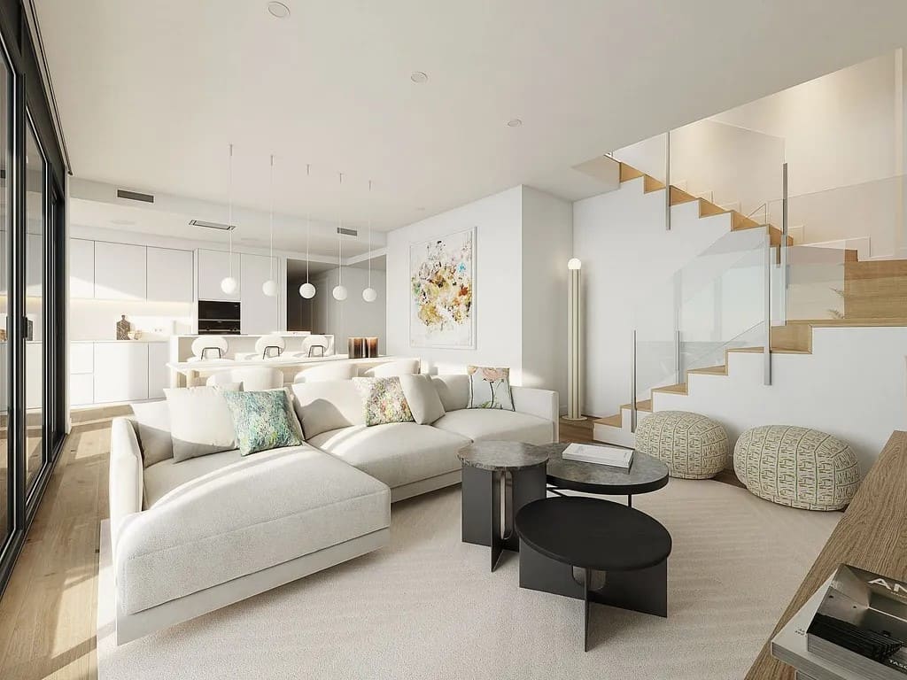 В квартире просторная гостиная открытой планировки, объединённая с кухней и столовой, а также выход на улицу — идеальное место для отдыха, обедов на свежем воздухе или создания приватной лаунж-зоны.