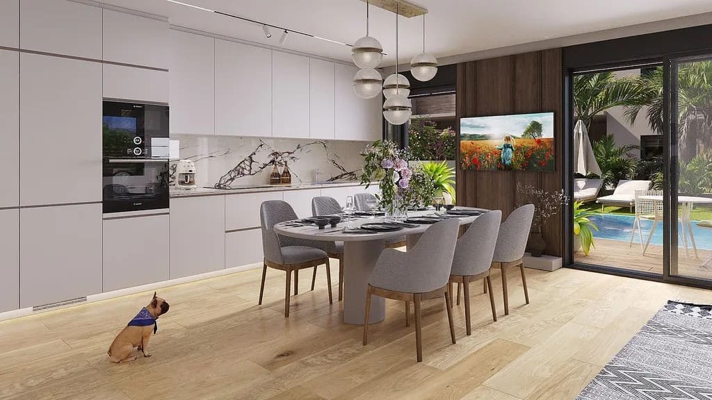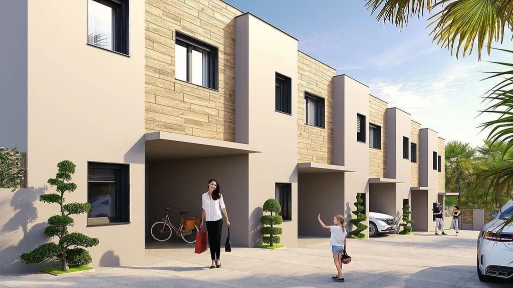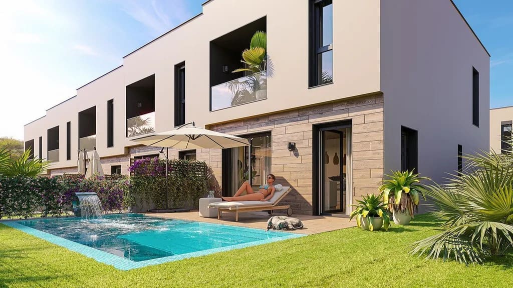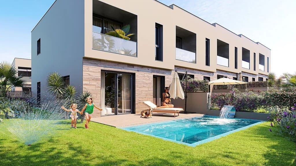 Новый жилой комплекс на улице Гладиол Торредембарра предлагает современные дома с продуманной планировкой, частными садами и бассейном, идеально подходящие для комфортной семейной жизни.