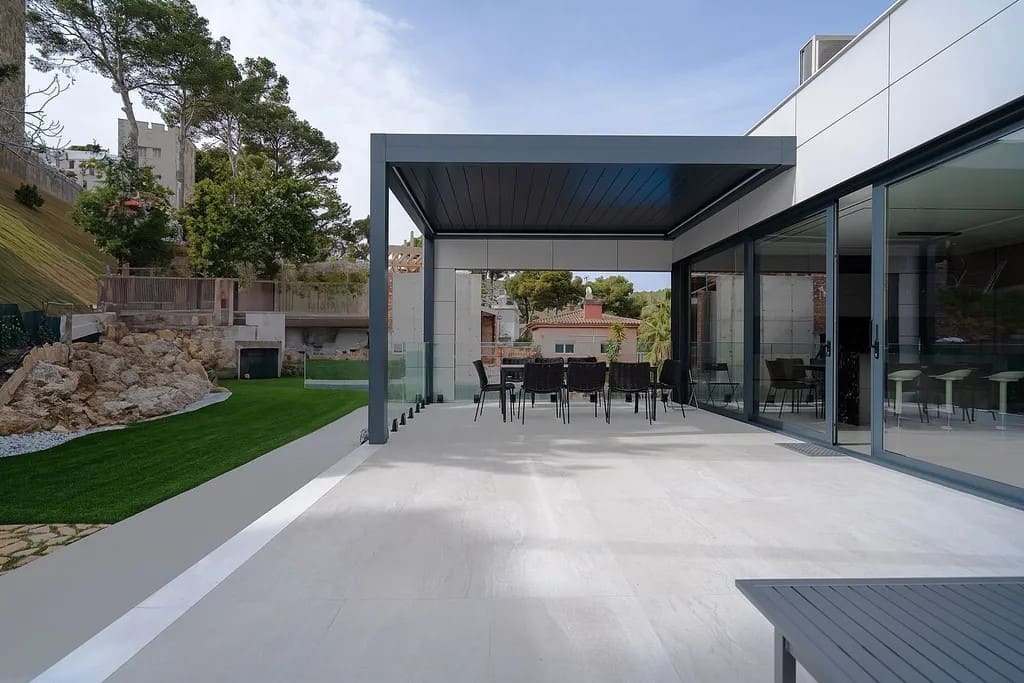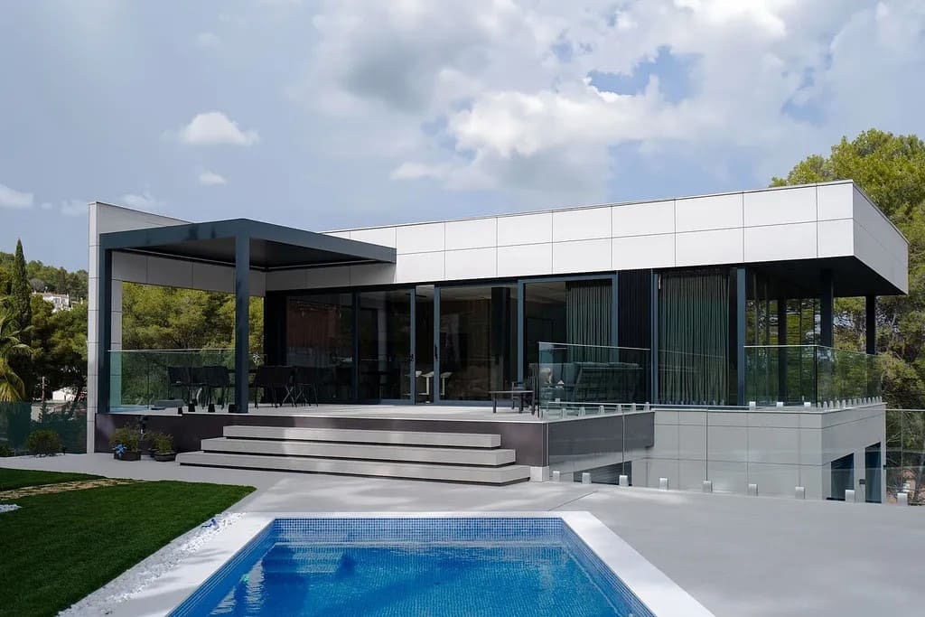 Отдельно стоящая вилла на продажу в районе Монмаре, Кастельдефельс. Современный дом новой постройки 2024 года с террасами и частным бассейном, спроектированный с акцентом на комфорт, технологии и приватность.