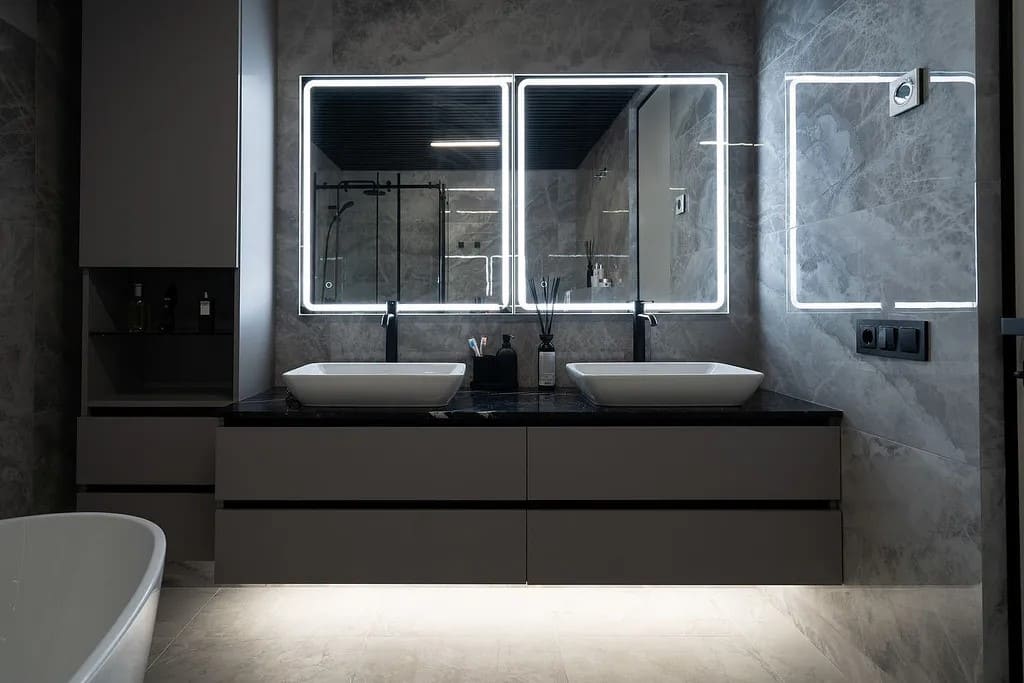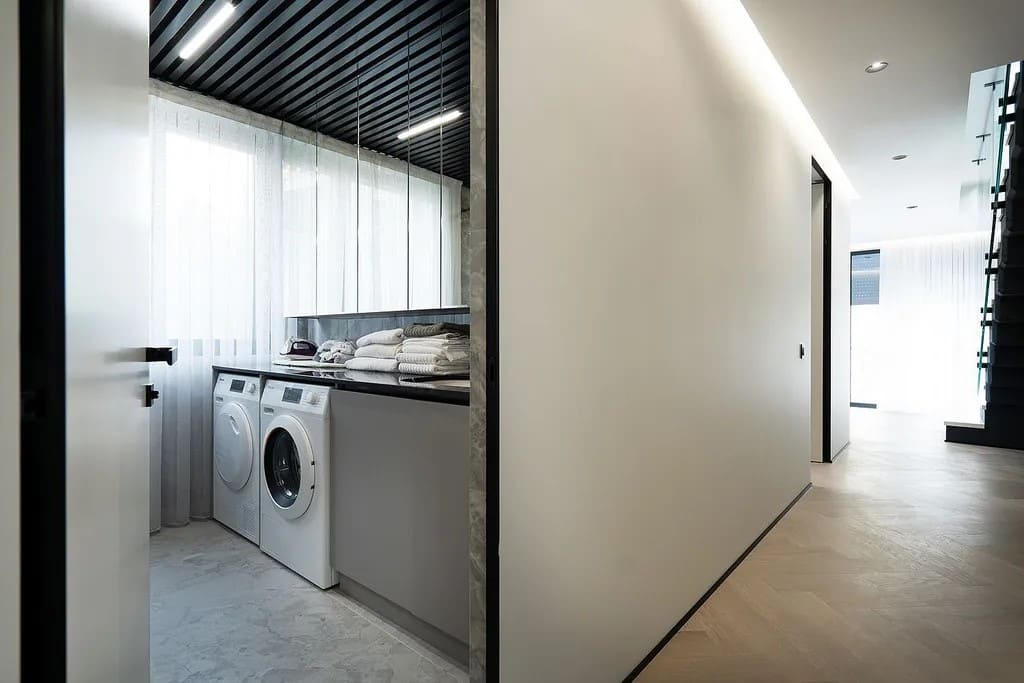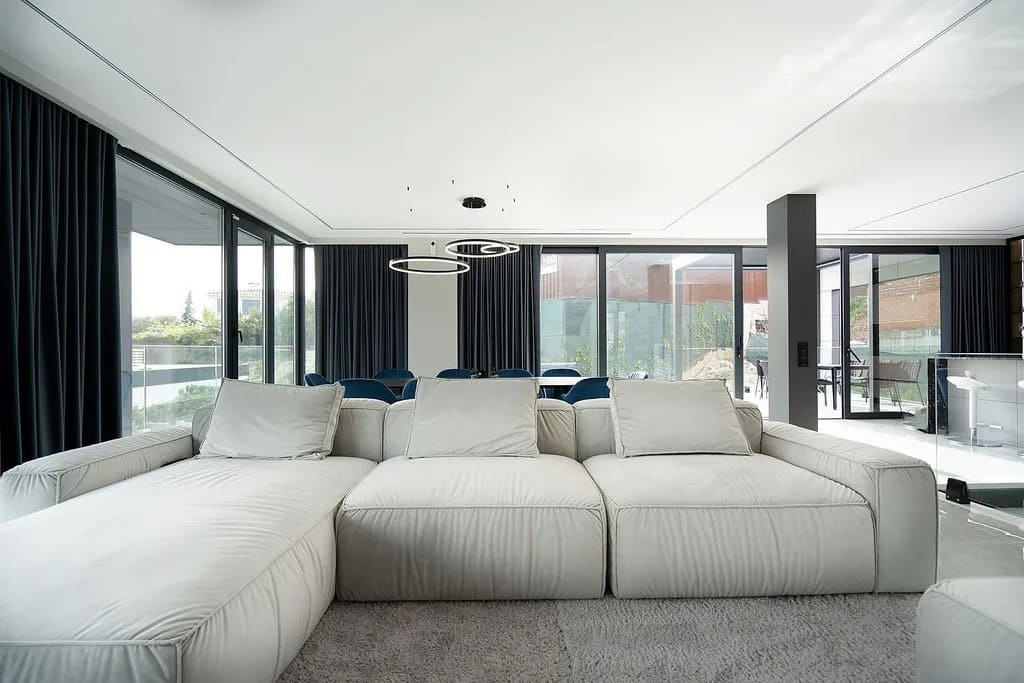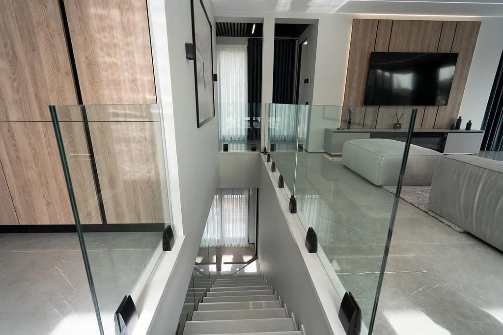 Вилла выполнена в современном архитектурном стиле и оснащена панорамными окнами Schüco, обеспечивающими обилие естественного света и открытые виды. Ванные комнаты оборудованы сантехникой премиальных брендов Villeroy & Boch и Grohe.