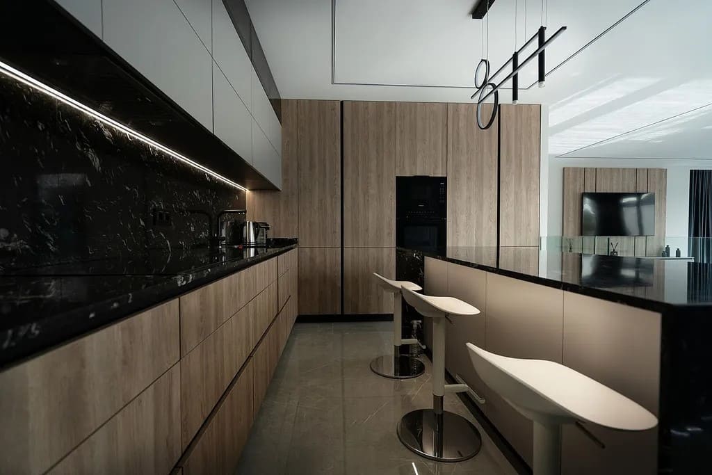 Дом оснащён аэротермической системой отопления и охлаждения, а также солнечными панелями, что обеспечивает высокую энергоэффективность и снижение эксплуатационных расходов. Кухня полностью оборудована современной высококачественной бытовой техникой, сочетающей функциональность и дизайн.