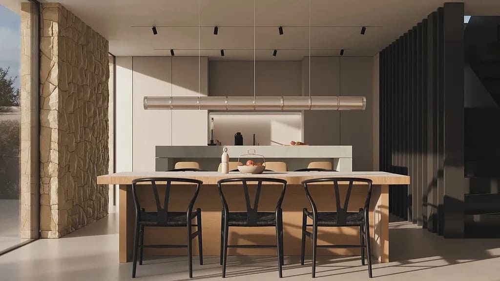 Техническое оснащение включает аэротермическую систему климат-контроля с возможностью установки теплых полов. Интерьеры выполнены с использованием крупноформатного керамогранита, подчеркивающего современный и элегантный стиль.